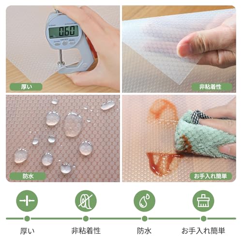 • [滑り止め・非粘着性] 両面とも非粘着性の素材なので、ライナーを簡単に取り出して掃除することができます。 食器棚シートは、虫、油、汚れと台所用品の滑りを防ぎ、カビの発生を有効に予防できます。台所用品や本やなどの品物の保護に役立たちます。