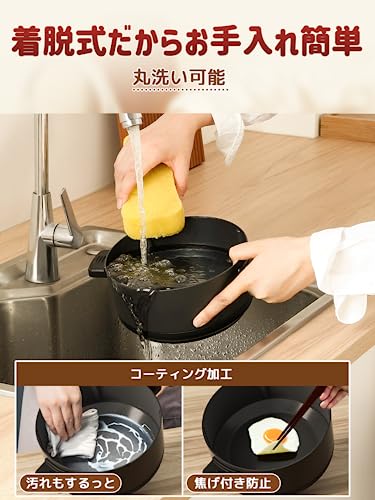 - 【お手入れカンタン】分離型デザインで、内鍋は取り外せて拭いたり洗ったりしやすく、後片付けの手間を軽減できます。鍋はフッ素加工で焦げ付きにくく、焦げ付きも防げるため、清潔な状態を保てます。 長いハンドルもないので、保管スペースを節約できます。