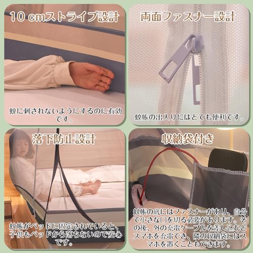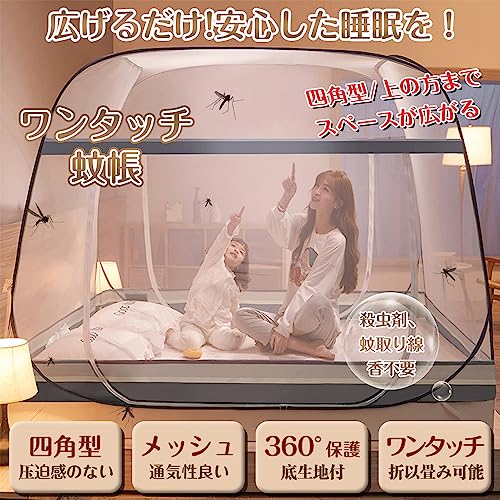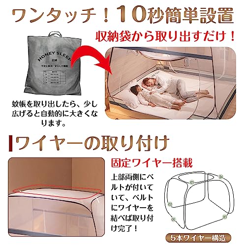 - 【10秒簡単設置&洗濯可能】ワンタッチで展開される蚊帳なので、初心者でも素早く取り付けることができ、蚊帳が開くと自動的に展開され、あとは上部の固定ワイヤーを取り付けるだけで完成です。慣れてくるとより早く設置を完了することができます。底部には固定ベルトも付属しており、ベッドで使用する際にも蚊帳を固定することができ、ズレが生じない。蚊帳本体は洗濯できる材質なので、そのまま洗濯すればいい。
