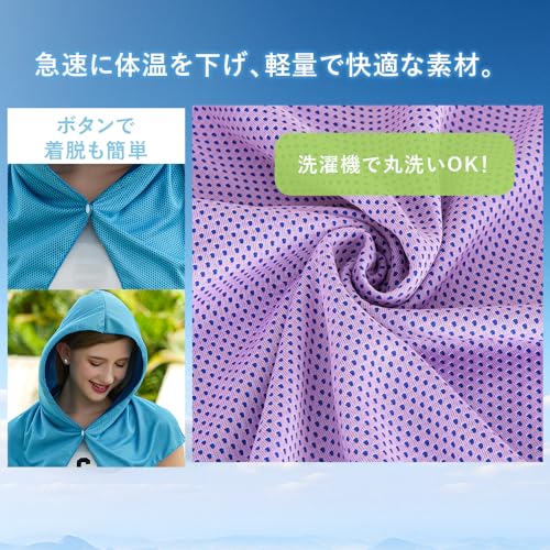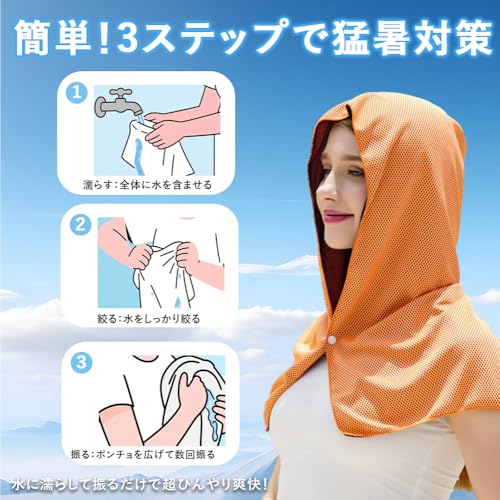 【商品名】 冷感フード付きポンチョタオル|UVカット・速乾・暑さ対策・熱中症予防br> 【商品説明】 振るだけ簡単!水分を含ませて数回振るだけですぐ冷却効果