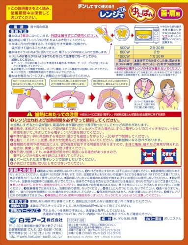 商品紹介 ●電子レンジでチンするだけで心地よい温かさになります。●温かくてやわらかいジェルが首や肩をやさしく包み込みます。●温かさは約30分持続します。(室温や使用環境により持続時間は異なります。)●ふわふわ素材の洗える専用カバー付きです。●くり返し使用できます。●首回りのサイズ:50cm【用途】首や肩の保温●長時間の作業で肩が重い時に。●寒い所での家事の時に。【使用方法】(1) 本体は2重袋になっています。外袋は破らずにご使用ください。(2)加熱前に電子レンジ内の汚れをよくふき取ってください。※本体に汚れが付着すると、その部分だけが異常に加熱され、袋が溶けて破れることがあります。(3)本体をイラストのように折りたたんで、電子レンジの中央に入れて加熱します。※ジェルの片寄りがないように手でもむなどして全体的に均一にしてから加熱してください。・ターンテーブル型の電子レンジを使用する場合は、加熱中、ターンテーブルが回っていることを確認してください。・必ず、電子レンジ機能で加熱し、オーブン機能、スチーム機能では加熱しないでください。・レンジ出力・加熱時間を越えて使用しないでください。(4)本体を専用カバーに入れた後、衣類の上から肩にのせてください。・カバー中央から本体の片方を図のように少し残して入れます。・もう片方も少し残して本体の中央が2cm程度外に出た状態にします。・開口部を広げ、出ている部分を折り曲げながら、重なるように入れます。・カバーの先端を細くまとめて、片側にある穴に通して軽く固定。500W:2分30秒600W:2分1000W:1分30秒温かさが足りない場合:本体を手でもみいほぐした後、温かさを確認しながら10~20秒ずつ追加過熱※加熱中は電子レンジのそばを離れないでください。※表示の加熱時間は15度の室温においた本体を45度まで温める標準的な加熱時間です。(45度はお風呂より少し熱い温度です。) 使用上の注意 ※この説明書きをよく読み、使用期間中は保管しておいてください。【加熱にあたっての注意】(1)レンジ出力および加熱時間を必ず守って使用してください。※加熱しすぎると中袋が破れ、高温の内身が漏れ出したり飛び散ったりしてやけどの恐れがあります)(2)加熱中、本体がふくれたり、中袋が破れえて赤いジェルが出てきた場合は、すぐに電子レンジのスイッチを切り、十分に時間をおいて、冷ましてから電子レンジの扉を開けてください。(3)本体が温かい時に再加熱する場合は、温かさを確認しながら10~20秒ずつ加熱してください。(4)自動モード(オート加熱、おまかせ加熱など)は使用しないでください。過剰加熱になる恐れがあります。(5)長時間の使用や使用状況により、袋の強度が低下する可能性がありますので、本体に亀裂、破れなど異常が見られた場合は、廃棄し、新しい商品にお取替えください。(6)表示通り加熱しても、本体表面が部分的に高温になる場合がありますので、電子レンジから取り出す時には注意してください。(7)カバーに入れたまま電子レンジで加熱しないでください。(8)子供だけで加熱、取り出しをさせないでください。【使用上の注意】(1)用途以外には使用しないでください。(2)やけどを防止するため、以下の点にご注意ください。・長時間同じ部位にあてないようにしてください。低温やけどの恐れがあります。なお、自覚症状をともなわないで低温やけどになる場合もありますのでご注意ください。・必ず専用カバーに入れて使用してください。・肌の弱い方、皮フに異常のある部位や熱をおびている部分には使用しないでください。・乳幼児やペット、泥酔時や就寝中には使用しないでください。身体のご不自由な方などがご使用になる場合は、まわりの方が十分にご注意ください。・熱いと感じたら、ただちに使用を中止してください。糖尿病等で血行障害のある方は、熱さを感じにくいことがありますので特にご注意ください。(3)医療機器ではありません。治療目的で使用しないでください。(4)落としたりぶつけたりしないでください。(5)食べられません。(6)万一、破れて中身が衣類等についた場合はすぐに水洗いしてください。(7)保冷用ではありません。冷凍・冷蔵しないでください。(8)電子レンジ以外の加熱はできません。(9)事故防止のため、使用中は製品を引っぱったり、引っかけたりしないように注意してください。【保管方法】使用しない時はポリ袋等に入れて、直射日光の当たらない温度の低い所に保管してください。【廃棄の方法】本体はプラスチックゴミとして、地方自治体の区分に従って捨ててください。【専用カバーについて】汚れたら、中性洗剤で手洗いし、洗濯後は陰干ししてください。洗濯時の注意については、カバー内側についている表示ラベルをご確認ください。 P.when('A').execute(function(A) { A.on('a:expander:toggle_description:toggle:collapse', function(data) { window.scroll(0, data.expander.$expander[0].offsetTop-100); }); }); 原材料・成分 成分:水、ゲル化剤、色素