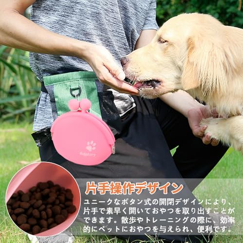 - 片手操作デザイン:ユニークなボタン式の開閉デザインにより、片手で素早く開いておやつを取り出すことができます。散歩やトレーニングの際に、効率的にペットにおやつを与えられ、便利です。
