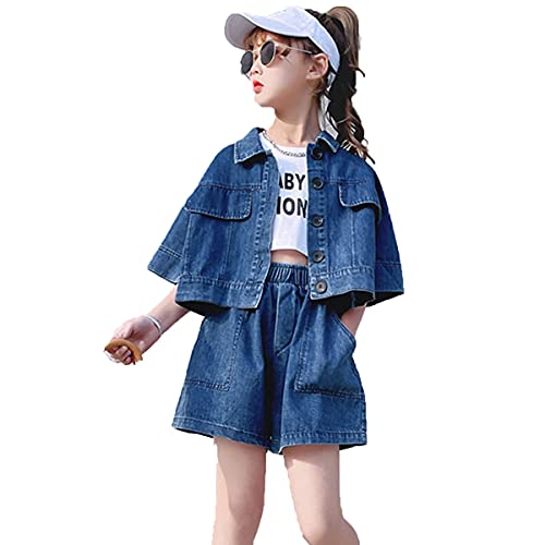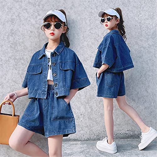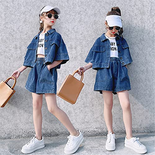 [JINPIN] 子供服 セットアップ デニム ジャケット ショートパンツ 2点セット 女の子 上下セット シャツ ジーンズ キッズ デニムパンツ ズボン ジャージ ガールズ ダンスウェア ジュニア 子供 スーツ 夏服 カジュアル おしゃれ 半袖 可愛い 通学夏 (ブルー2,150)